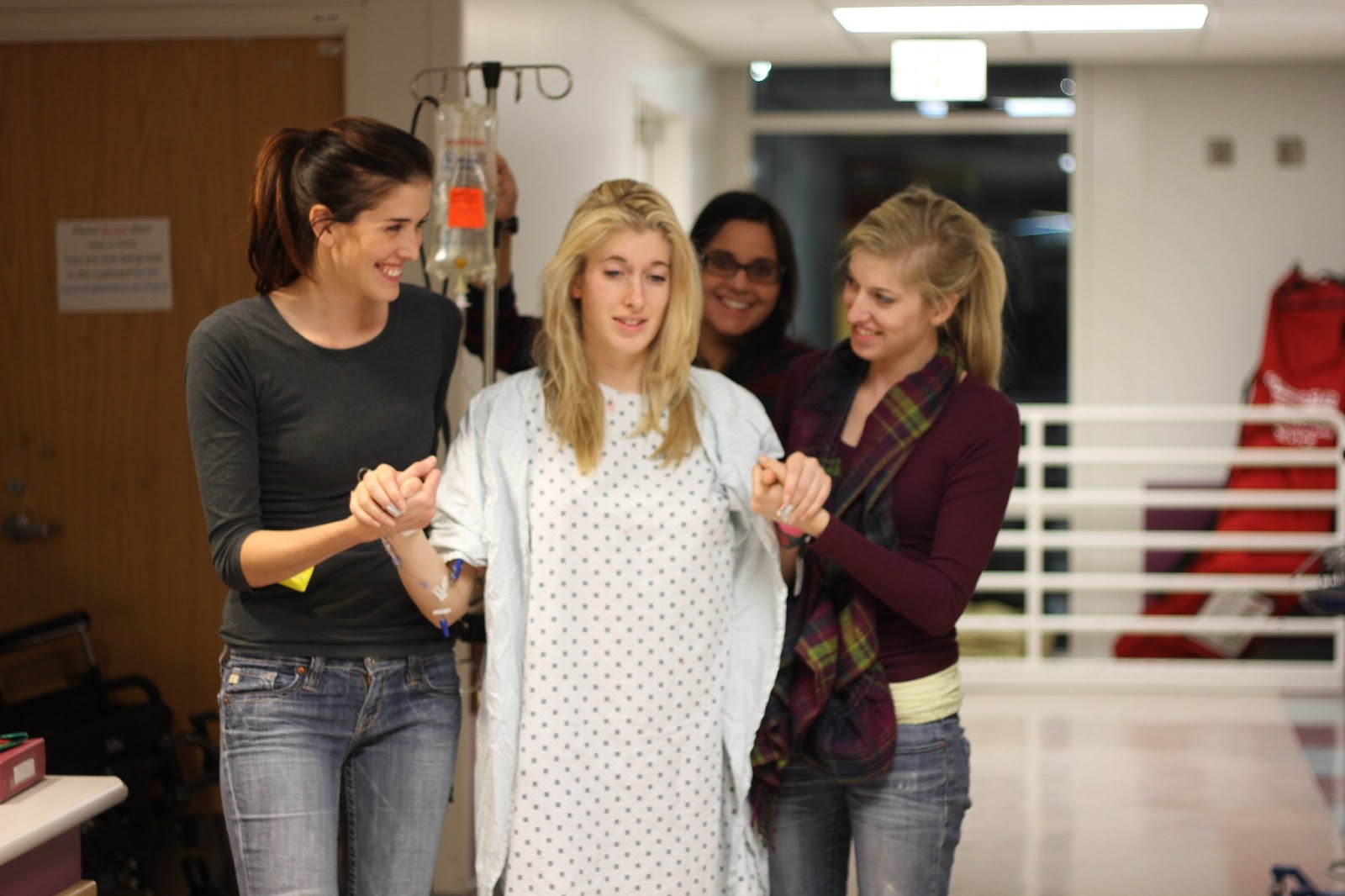Andrea on my right side Alisha on my left and Maria dragging my pole of meds. We joked as we walked back and down the hall and back into my room.