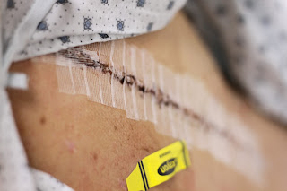 The next morning the doctors got a good look of my back and took the liberty to remove the large brown bandage along my back. This was what was left. Not too bad I thought. I really liked the crayon band-aids. 🙂